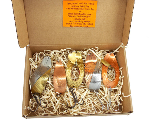 Traditional fishing spoon set, five-piece handmade fishing spoon set, gold pike spoons, copper salmon lure with treble hook