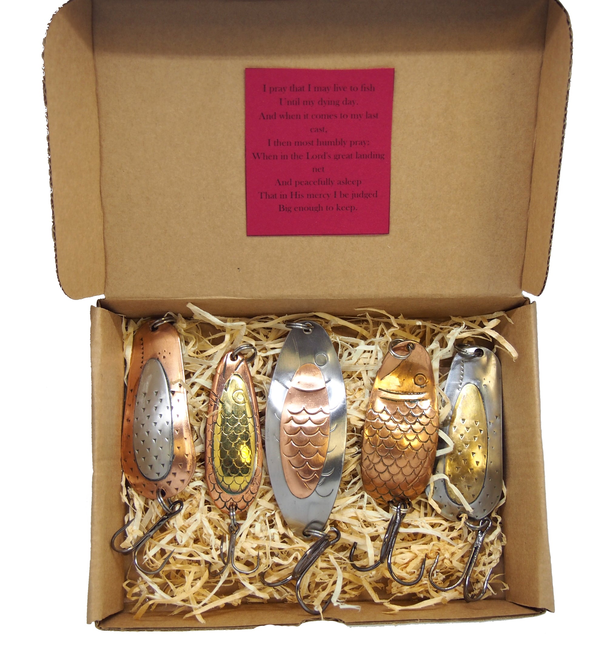 Land your next big catch with our 5-piece handmade Fishing Spoon Set, ideal for pike and salmon fishing. Each spoon is meticulously crafted from high-quality gold and copper, designed to shimmer under water and attract fish from a distance. The treble hook design ensures a solid catch every time, making this a must-have for serious anglers.